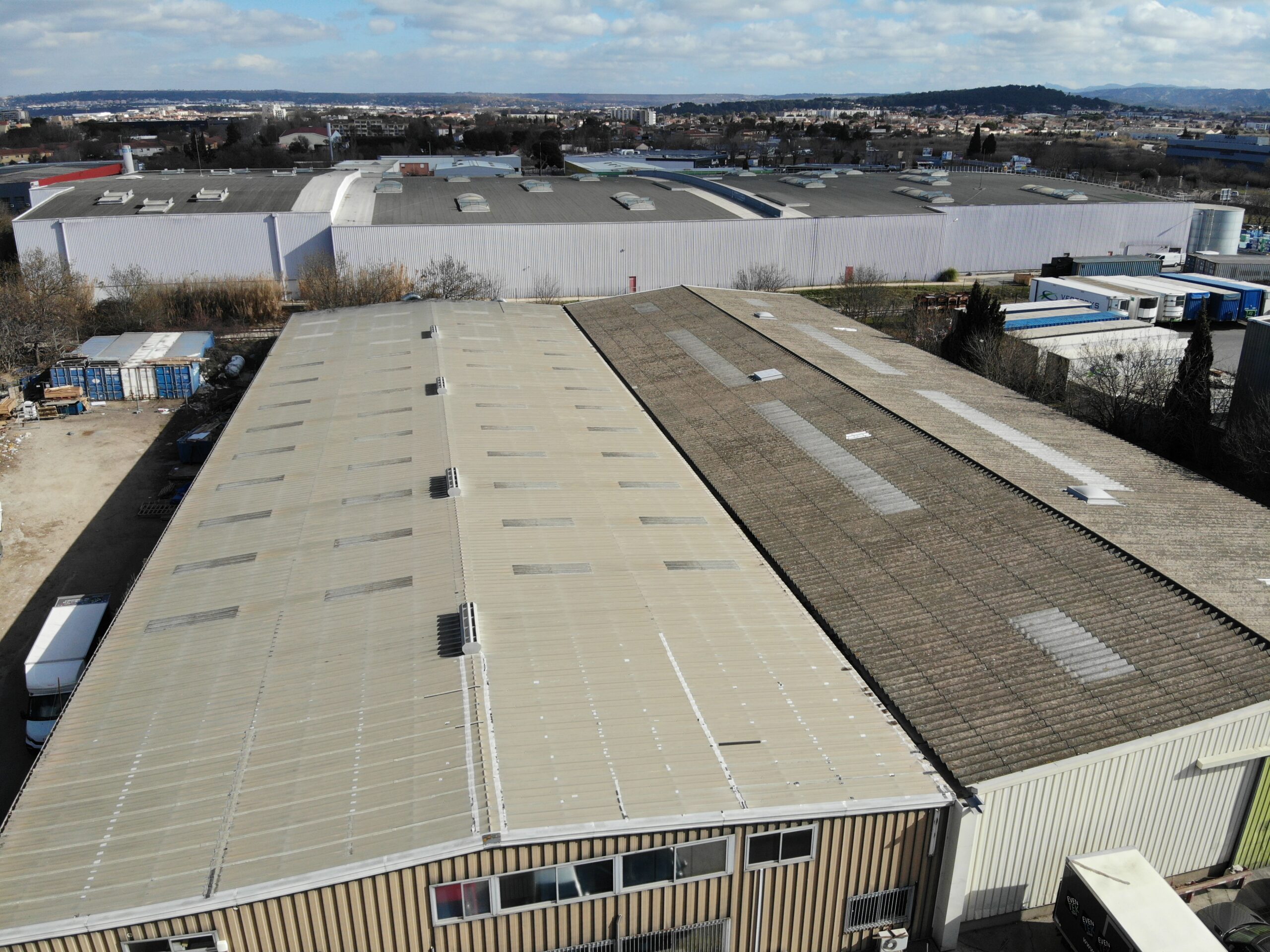 Désamiantage et installation de panneaux photovoltaïques en toiture d’un bâtiment commercial à Marignane.